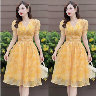 Đầm nữ cổ v tay phồng đính nút dáng xòe phối màu vàng dịu sang trọng thanh lịch cho nữ đi tiêc,công sở