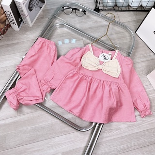 Đồ bộ bé gái, Set tiểu thư áo sơmi babydoll dài tay cổ vuông nơ ngực và quần dài chất đũi cho bé 8-20 kg, SUN KID'S