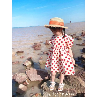 Váy bé gái babydoll tay phồng phối 2 nơ xanh phía sau họa tiết chấm bi xinh xắn, dáng xòe cho bé gái từ 9 đến 19 kg