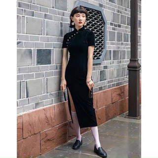 Sườn Xám Vải Nhung Đen Trơn Dáng Dài 40-70Kg