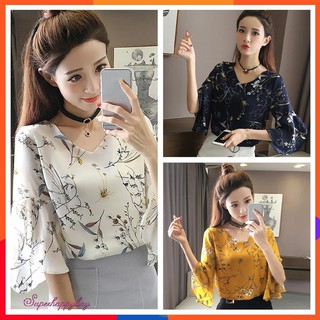 Áo tay dài nhún bèo họa tiết hoa thời trang Hàn Quốc thời trang cho nữ