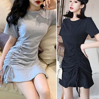 Đầm tay ngắn dây rút màu trơn thiết kế thanh lịch
