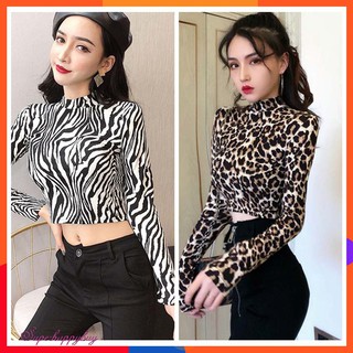 Áo croptop cổ lọ tay dài họa tiết da báo/ngựa vằn thời trang