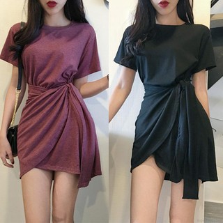 Áo thun tay ngắn cổ tròn màu trơn thiết kế lệch tà phong cách trẻ trung cho nữ