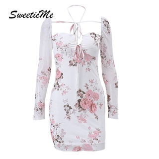 Đầm Ôm Dáng Hở Vai Phối Lưới Họa Tiết Hoa Tương Phản Thời Trang Mới 2023 Dành Cho Bạn Nữ