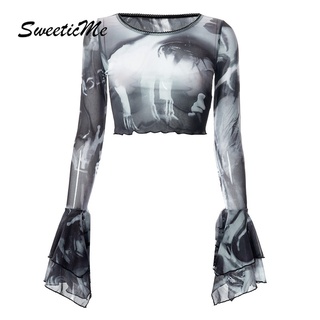 Áo Thun Tay Dài Cổ Tròn Hở Rốn In Họa Tiết Mới Dành Cho Nữ
