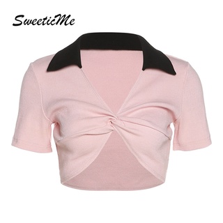 Áo Thun Croptop Cổ Bẻ Tay Ngắn Màu Tương Phản Thời Trang Mới Cho Nữ