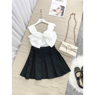 set xinh áo bản to nơ ngực kèm chân váy dập ly bánh bèo tiểu thư