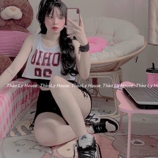 Sét áo kiểu croptop tay dài trơn phối quần đùi rút dây cực hot , chất thun gân mềm mịn