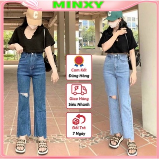 Quần jean nữ ống đứng cắt gấu quần bò suông xẻ rách gấu hách dáng chất jeans co giãn tốt-MINXY SHOP
