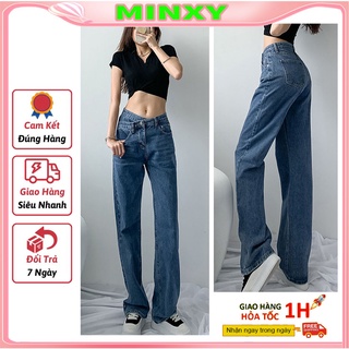 Quần bò ống đứng quần jean bò ống suông jeans nữ cạp cao ống rộng cắt gấu co dãn 4 chiều-MInxy shop