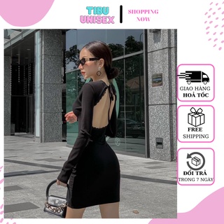 Đầm Body Cổ Tàu Hở Lưng TIBU, Váy Nữ Ôm Dáng Sexy Phối Nơ Sau Lưng Cực Xinh