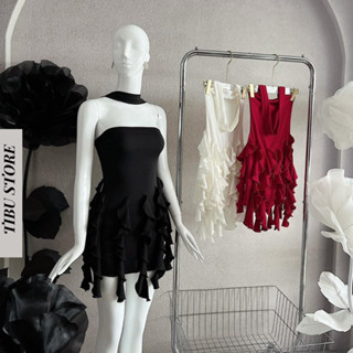 Đầm yếm tua rua TIBU váy body nữ hoa cổ phối bèo sexy tiểu thư dự tiệc sang trọng