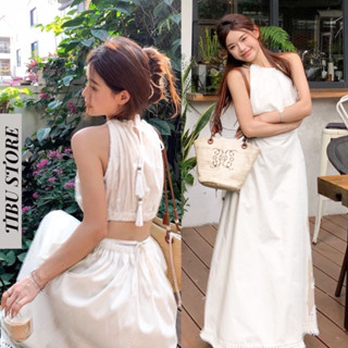 Váy Maxi Cổ Yếm Hở Lưng TIBU Đầm Đi Biển Dáng Dài Thắt Nơ Eo Màu Trắng Sang Chảnh