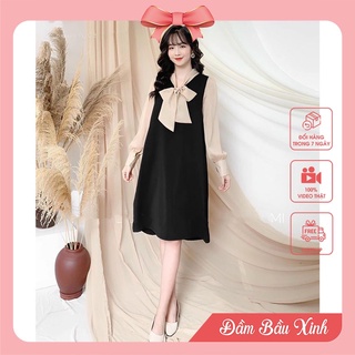 Đầm bầu công sở phối cổ thắt nơ thanh lịch, đầm bầu dáng suông tay dài 2 màu sang chảnh chất đũi tay voan - Tirahouse