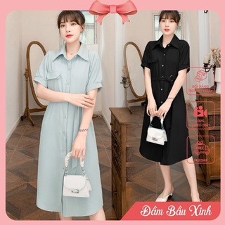 Đầm bầu công sở sơ mi thắt eo váy sơ mi tay lỡ hai màu hottrend năm 2022