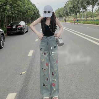 Quần jean dáng suông dài kiểu rách phối họa tiết chữ hàng đẹp!