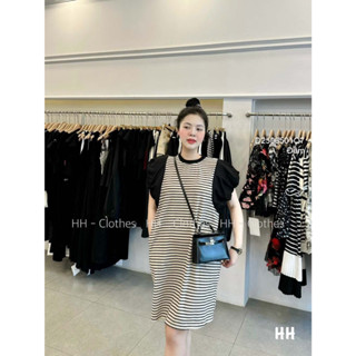 Đầm dáng suông dài kẻ sọc cổ tròn phối tay bồng đen ngực gắn mác!