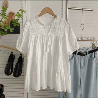 Áo kiểu xô trắng dáng babydoll phối cổ thắt dây nơ tay ngắn!