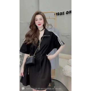 Đầm thun kiểu rút eo phối cổ khóa kéo ngực chữ tay ngắn phối viền sọc!