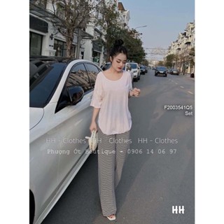Set bộ thun 2 món áo trắng kiểu vạt bầu tay ngắn phối quần suông dài kẻ sọc ngang hàng QC!