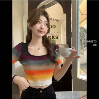 Áo len dáng croptop sọc màu gợn cổ bẻ hàng đẹp!