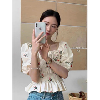 Áo kiểu cổ U phối họa tiết hoa thêu nhún chun hàng nhập!