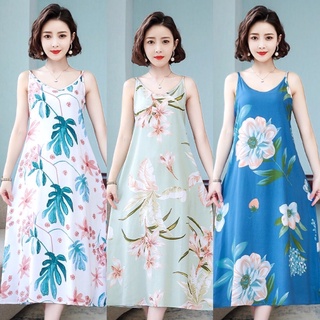 Váy ngủ, váy bầu lanh lụa Quảng Châu hai dây họa tiết trẻ trung, thời trang