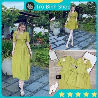 Váy li cúc đồng nhún eo 2 form dài và ngắn màu xanh cốm hottrend 2022, váy dáng xòe cổ tròn tay bồng đính cúc dọc