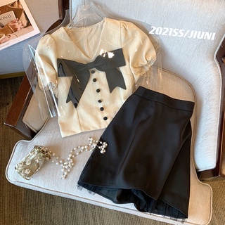 Bộ áo đính nơ + chân váy ngắn thời trang xuân hè 2022 cho nữ có bán lẻ