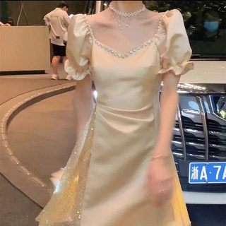 Đầm đuôi cá tay ngắn cổ vuông màu trắng phong cách Pháp thời trang mùa hè mới 2021