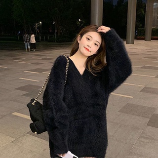 Áo khoác len cổ chữ V màu đen thời trang nữ tính