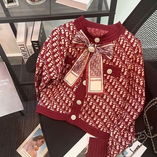 French red chic and unique fragrant coat women's 2022 new design retro bow knitted blouse