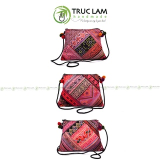 Túi Đeo Chéo Thổ Cẩm Phối Vải Da Lộn Gắn Quả Bông Thời Trang TCT172 Trúc Lâm Handmade