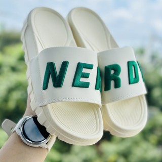 Dép nerdy quai ngang nam nữ đế Left Right cao 4cm, quai chữ NERRDY thêu nỗi ❤️FREESHIP + HỘP hãng❤️ kem xanh