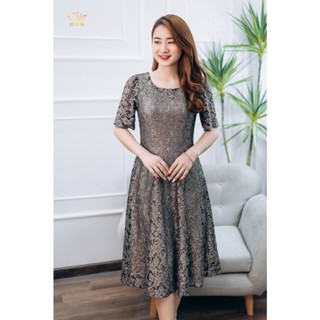 Đầm xòe thiết kế trung niên TTV1371 Cổ tròn tay ngắn màu Ren xám đi chơi đi tiệc trẻ trung