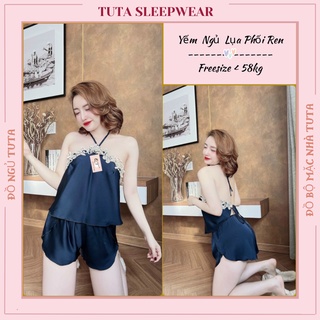 Đồ ngủ nữ sexy bộ lụa mặc nhà 2 dây phối ren gợi cảm cột dây 2 bên xinh xắn
