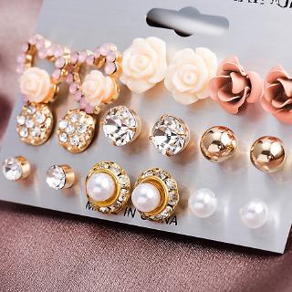 9 Pairs/ Set Crystal Pearl Flower Exquisite Women Stud Earrings Jewelry