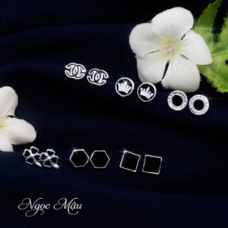 Khuyên tai nụ hồ ly, pha Lê đen trắng, đinh, oliu, đinh bạc thật mạ vàng trắng tròn vuông sao