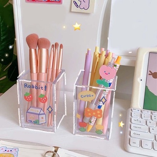 Ống cắm bút hình vuông trong suốt để bàn đa năng có Sticker dễ thương - Ống đựng bút, cắm cọ trang điểm dễ thương