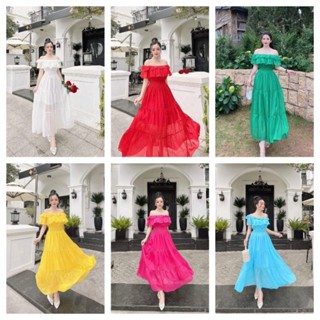 Maxi đi biển đẹp. Maxi trễ vai tơ óng xoè tầng váy đẹp chụp ảnh.