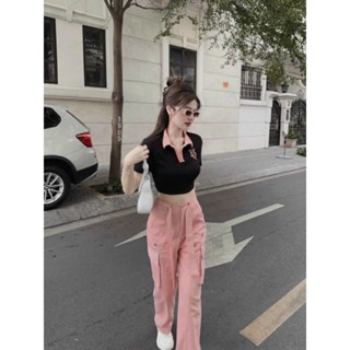 Sét kiểu nữ áo crop top viền cổ hồng phối quần kaki hộp.