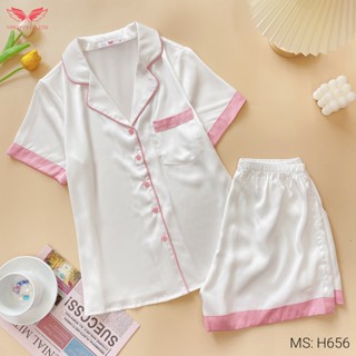 Đồ bộ nữ Pijama mặc nhà Lụa cao cấp mùa hè VINGO tay ngắn quần đùi trơn hồng trắng dễ thương H656 VNGO