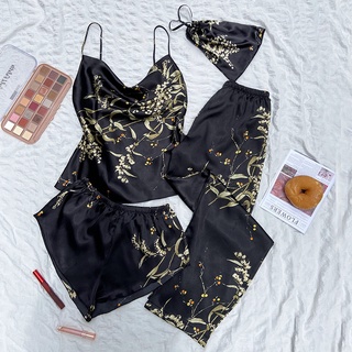 Bộ Đồ Ngủ 4 Món Bằng Lụa Mát In Họa Tiết Thời Trang Quyến Rũ Cho Nữ