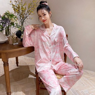 Bộ đồ ngủ tay dài vải lụa satin mát nhẹ in họa tiết sang trọng thời trang cho nữ