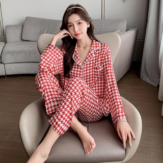 Bộ đồ ngủ vải lụa satin tay dài in họa tiết caro giản dị cho nữ