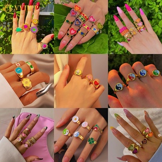 Nhẫn đeo ngón tay vàng phối nhiều màu sắc hình trái tim/ bông hoa/ hình học phong cách retro thời trang cho nữ