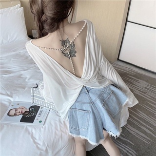 Áo Thun Tay Dài Hở Lưng Phối Dây Chuỗi Ngọc Trai Mỏng Chống Nắng Phong Cách Hàn Quốc Thời Trang Mùa Hè Quyến Rũ Cho Nữ