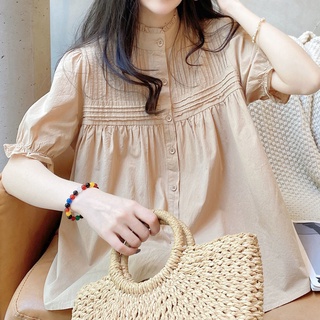 Áo Sơ Mi Nữ Cổ Tròn Tay Ngắn Bồng Phong Cách Hàn Quốc