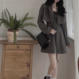 Áo khoác có dây cột bụng/Đầm yếm dáng ôm màu xám trơn kiểu Pháp cao cấp thời trang xuân thu 2021 cho nữ (bán lẻ)